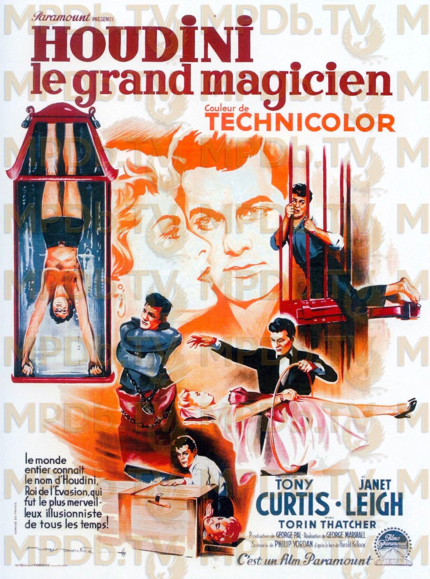 Houdini, le grand magicien : Alors qu’il joue les hommes des cavernes dans une fête foraine pour gagner sa vie, Houdini s’éprend de Bess, une jeune étudiante qu’il finit par épouser. Son rêve est de devenir magicien, mais Bess le supplie de renoncer à un métier aussi aléatoire. Employé par un constructeur de coffres-forts, il s’initie aux secrets de fabrication des serrures, puis gagne un concours en se libérant d’une camisole de force non truquée. La récompense est un voyage en Europe où il remonte sur scène avec Bess comme partenaire, et devient célèbre en défiant Scotland Yard de le retenir plus de vingt-quatre heures dans une cellule de prison....